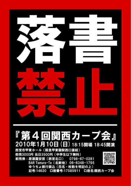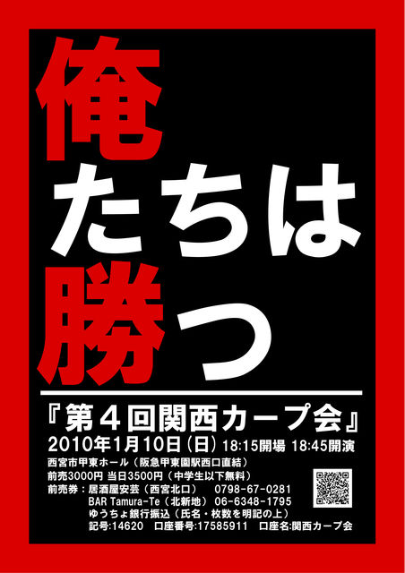 皆様! おまっとさんでした!(・∀・) 2010年1月10日の日曜日に、西宮市甲東ホールにて、 カープOBの木下富雄さんや、スポーツジャーナリスト田辺一球さんらをお呼びしてのトークショー、 「第4回関西カープ会」が行われます!! ↓詳しくはこちら。 http://mixi.jp/view_community.pl?id=4732312 その前日、「関西カープ会前夜祭」ということで、 居酒屋こんごの姉妹店、「旬鮮 鉄板厨房 花や」にて新年会を行います!!(・∀・) 関西のカープファン同士の交流を深めながら、 カープの躍進を信じて 共に語り、