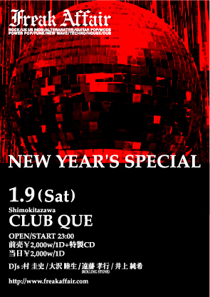 『FREAK AFFAIR』 -NEW YEAR'S SPECIAL- 1/9(SAT) DJ/ 村 圭史 大沢睦生(WILLY) 遠藤孝行(新宿ROLLING STONE) 井上純希 OPEN&START 23:00 前売\2000(1DRINK+特製CD) 当日\2000(1DRINK) @下北沢CLUB QUE [問]QUE 03-3412-9979 18歳未満の方は入場できません。 逆に言うと18歳以上の方ならOKです。 今回は毎回恒例の-NEW YEAR'S SPECIAL-です。 お正月という事でお屠蘇代わりのワイン飲み放題!!や、お年玉代わりの豪華プレゼント大会ももちろんご用意してます!! さらに、フリークのDJが「今」の気分をコンパイルした