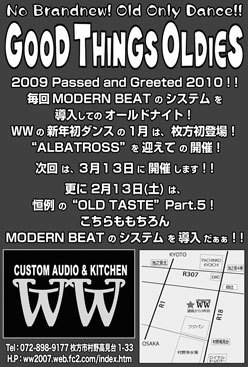 告知失礼します。 新年一発目のゲストは 結成7周年を迎えた ALBATROSS リンクアップサウンドは 滋賀県より SOUL FLYを迎え もちろん MODERN BEAT SOUND SYSTEMを 導入しての開催 No Brandnew! Old Only Dance!! GOOD THINGS OLDIES 2010.1.9(土) at:WW =Guest Sound= ALBATROSS =Link Up Sound= SOUL FLY from Shiga =Regular Sound= WAVE BEAT EXTRA MODERN BEAT with Sound System Start:24pm-Till Morning... ADM:\500-.+1drink別途 WW 枚方市村野高見台1-33 tel.0728989177 WWコミュ http://m.mix