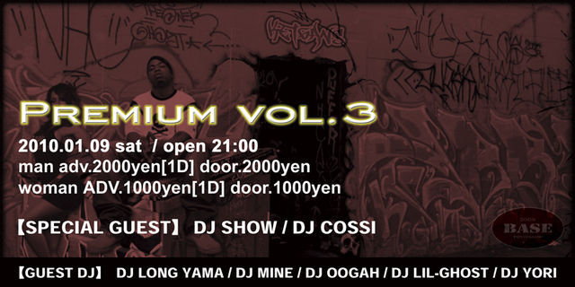 イベント告知失礼します。 ■Premium vol.3 ■@BASE / 0532-55-2201 ■2010.01.09[SAT] OPEN21:00 ■前売:男2000円[1D] / 女1000円[1D] ■当日:男2000円 / 女1000円 ■SPECIAL GUEST ・DJ SHOW ・DJ COSSI ■GUEST ・DJ LONG YAMA ・DJ BISHI ・DJ OOGAH ・DJ LIL-GHOST ・DJ YORI 2010年1発目PREMIUM Vol.3 間違いないキャストだと思います 2010.1.9(土)はBASEに集合です