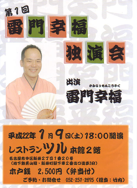 出演 雷門幸福(落語一席) 日時 1月9日(土) 18時開演 場所 レストラン・ツル(名古屋市中区新栄2丁目1番20号) ※ 地図参照 木戸 2500円(お弁当付き!!) 予約・お問合せ 052−251−2675(担当 竹内)