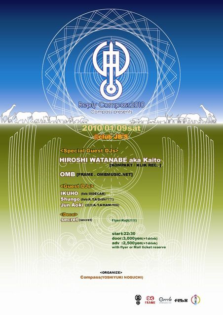 当日は宜しくお願い致します =[Special Gest DJs]= HIROSHI WATANABE aka Kaito OMB Compass presents -Reply Compass2010- ==2010/01/09sat== @club JB'S(Nagoya) =Special Guest DJs= HIROSHI WATANABE aka Kaito ( KOMPAKT / KLIK REC. ) http://www.hiroshiwatana.be/index.html OMB (FRAME . OMBMUSIC.NET) http://www.ombmusic.net/ =Guest DJs= IKUHO (feb / SIDECAR) Shungo (feb/A.T.A/Drift/円空) Jun Aoki (潤潤/A.T.A/HAM:TIN) =DECO= secret(secret) =ORGANIZE= Compass(YOSHIYUK