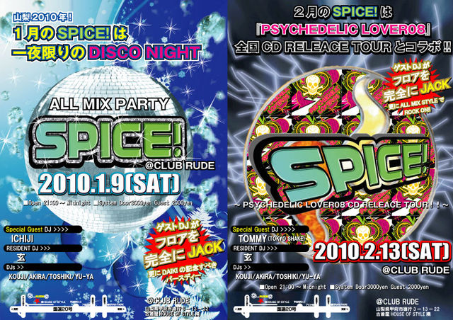2010.1.9(SAT) 『SPICE!』 〜DISCO NIGHT!!〜 @CLUB RUDE (山梨県甲府市徳行3ー13ー22 古着屋HOUSE OF STYLE隣) ●OPEN→21:00 ●FEE→GUEST:2000yen、DOOR:3000yen ●GENRE→ALL MIX ●GUEST DJ ICHIJI ●RESIDENT DJ 玄 ●DJ's KOUJI.AKIRA.TOSHIKIYU-YA ●Produced by DJ DAIKI 1月のSPICE!はお洒落な雰囲気を演出し甲府CLUB RUDEで一夜限りのお洒落なDISCO NIGHTを開催します♪ 今回は山梨屈指のALL MIX STYLE DJのICHIJIを招いて完全にフロアをJACKします! またSPICE!生みの親PRO