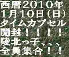 新年明けましておめでとうございます。大きな同窓会の意味合いもあります。本年をよい年にする意味でも20年前の旧友あるいは自分と対話する貴重なイベントに参加しましょう!!! 20年前の自分が今の自分に送ったメッセージ、大切な宝物が一つ増えそうで、私も楽しみにしています。ぜひ参加したいと思っています。実行委員の皆さまの苦労に心から感謝☆ mixi陵北コミュの皆さま!敬意を表して是非是非参加して盛り上げましょう!!! 日時: 2010年1月10日 AM9:00〜 場所: 陵北小学校 主催: タイムカプセル実行委員会 対象者: