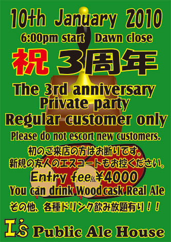 こんばんは、I'sのマスターです そろそろ、開催日が近づいてきたので、ご案内しまぁ〜す 早いもので、沖縄発のハンドポンプ導入のパブをオープンして3年になろうとしています。 これも、今まで協力してくれた方々とI’sを愛してくれているお客様方のおけげです ホントに感謝の気持ちでいっぱいです。 って事で、来年の1月10日日曜日は、オープン3周年祭を開催します 開催日 2009年 1月10日 時間 18時〜夜明けまで 会費 4000円 各種ビール及び指定銘柄のカクテルやウイスキー、