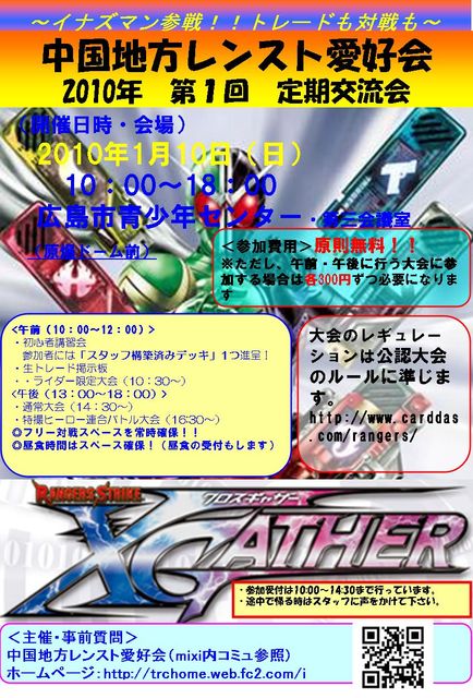 随時、情報更新します。 クロスギャザーも3弾まで発売。スターターフライング現象をおこしつつカウントダウンの真っ最中。みなさんも脳内でデッキ構築中ではないでしょうか?久々ですが、 今年もやります。 2010年 第1回 交流会を企画しました。ふるってご参加ください。 日 時:2010年1月10日(日)10:00〜18:00 ※18:30には退室完了します。 場 所:広島市青少年センター(http://www.hitomachi.city.hiroshima.jp/y-center/) 2階 第三会議室(25名定員) ※旧広島市民球場の横。 参加費:原則無料。