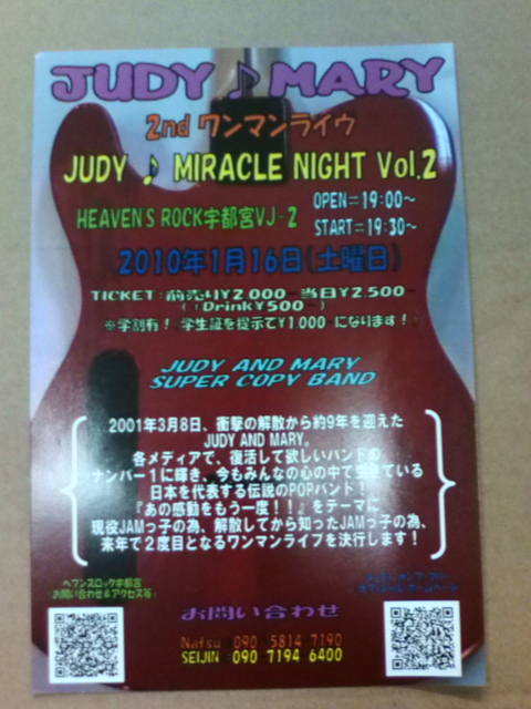 去年も開催させていただきました、ジュディマリのスーパーコピーバンド『JUDY ♪ MARY』と申します! 大盛況だった去年の初ワンマンから、はや一年… またまた勝手ながら決定しちゃいましたよ!J♪M(ジュディーオンプ マリー)のワンマンライヴです! JUDY AND MARY好きは必見ですよ!(^^ゞ JUDY ♪ MIRACLE NIGHT Vol.2 『JUDY ♪ MARY ワンマン ライヴ』 2010年1/16(土曜) 場所: HEAVENS ROCK宇都宮VJ-2 時間: 19:00オープン 19:30スタート チケット: 学生¥1000 一般 ¥2000 当日券 ¥2500 (ドリンク代+