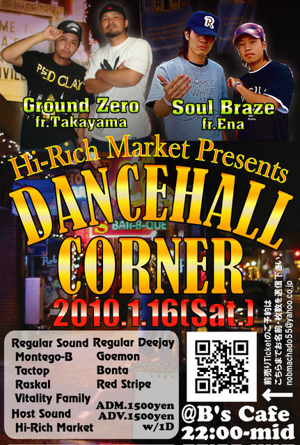 管理人様告知失礼します。 2010年、新たに始まるNew Dance!! Hi-Rich Market Presents "DANCEHALL CORNER" 岐阜地区のGeneration Sound がB'sCAFEに集結! Brand Newを中心にOldiesから各Soundが 個性あふれるPlayで上がっていきます 発展途上REGGAEここにあり!!! 記念すべき第1回目のGuest Soundは 北は高山 GROUND ZERO 東は恵那 SOUL BLAZE が登場!! ★★★★★★★★★★★★★★★★★★★ 2010.1.16(Sat.) ■■■■DANCEHALL CORNER■■■■ Brand New Reguler Dancehall Session