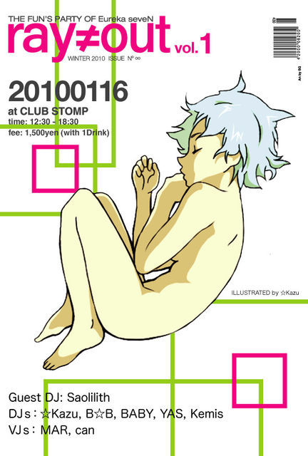 //////////////////////////////////////////////////////////// 2009年・夏、大阪にもエウレカセブンのイベントを!という事で 立ち上がった【ray≠out】が帰ってきました!!! //////////////////////////////////////////////////////////// 【ray≠out vol.1】 場所:心斎橋 club STOMP 日時:2010年1月16日(土) 12:30〜18:30 料金:1500yen / with 1 Drink 時間帯は前回同様、お昼間での開催! クラブ初心者の人も、夜のミナミは少し怖い…と、いう人でも安心して お越し下さい。 もちろん、クラブ初めての人も是非、お