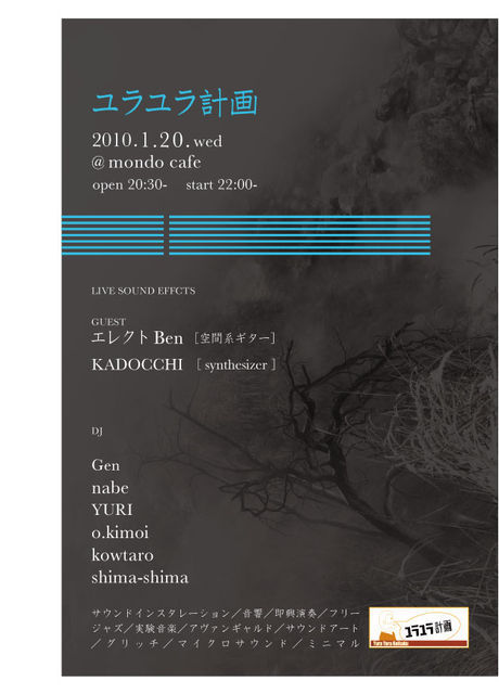告知失礼致します。 平日なのですが、どっぷり深くユラユラしませんか? ■□■■■ユラユラ計画■■■□■ 2010.1.20 wed @ mondo cafe open 20:30 - start 22:00 - No charge ■■live sound effects 〔 guest 〕 エレクトBen : 空間系ギター from香川 KADOCCHI : Synthesizer ■■DJ Gen nabe YURI o.kimoi kowtaro shima-shima ----------------------------------------------------------------------