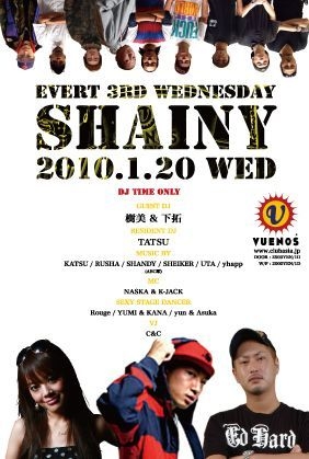 管理人様告知失礼致します!!! VUENOSでも数少ないDJ TIME ONLYのイベントといえばSHAINY 平日DJ TIME ONLYながら良質な雰囲気と毎月400人以上のPARTY PEOPLE達で人気爆発中です DJ下拓の毎月参加も決定し2010年、SHAINYは一発目からいきなりかっ飛ばしていきますよ ゲストのDJ樹美、DJ下拓のPLAYはもちろん現場第一主義のDJ TATSUを中心にDJ SHEIKER、DJ RUSHA等のレギュラーDJ陣のPLAYも大注目 OPENからCLOSEまで本当に目がはなせません! ステージを華やかに演出するSEXYなステージダンサーも要