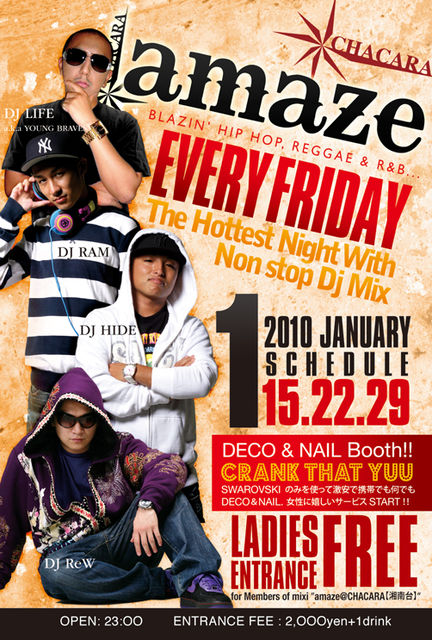 横浜なノリを満喫できるイベント! 横浜ベイホールで開催されているJEWELZにも参加しているSBE(http://www.sbe-one.com)をメインに、同じくJEWELZに参加しているGlamstar(http://www.glamstar.info)、福生、都内、横浜、沖縄、三沢などでイベントを行っているUncut Flava(http://www.uncut-flava.com)、その他にもいくつかのグループが参加! 【1/22(金) Staright Bangin'! @ 横浜Club QUEST】 女性は0時半まで入場無料! 「Uncut Flavaのゲストです」とゲスト宣言するか、Uncut Flavaメンバーカードを提示すると、1000円(w/1D)で入場できます
