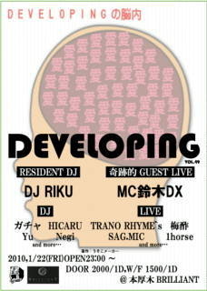 《場所》 BRILLIANT 本厚木 《日にち》 1/22 (金) 《時間》 22時〜 《料金》 1500/1D 【GUEST LIVE】 MC鈴木DX 【RESIDENT DJ】 DJ RIKU 【DJ】 ガチャ HICARU Yu Negi 【LIVE】 TRANO RHYME's 1horse SAG MIC 梅酢 神奈川のマザファッキンパーリピーポーこと東海大学生のみなさん、こんにちは! 今月はDEVELOPINGの月であります★ 今回のゲストライブには MC鈴木DXさん! 男ウケ抜群! この人を好きな女の子は間違いない! って感じです。 来たらわかります。