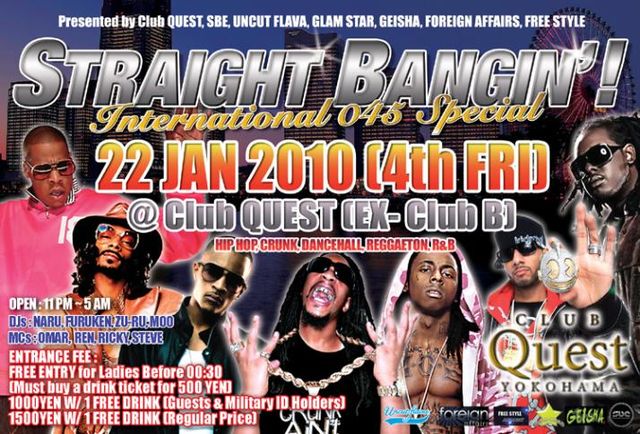 今週の金曜日夜(1月22日)、クラブQUEST 横浜にてSTRAIGHT BANGIN'が開催されます。 ☆☆☆女性入場無料!(12時半まで/ 入場時500円にて1ドリチケ購入要)☆☆☆ お客さんが主役のDJオンリーHIP HOPパーティーです。 横浜を代表するかなり盛り上がる熱いイベントです。本物のパーティーヘッズが集まる、おもいっきり楽しめるパーティーです。 是非遊びに来てください! ◆ 前回のパーティー写真(直リンク): http://www.sbe-one.com/files/SBE_QUEST_01082010_photogallery.jpg ★“SBEのゲスト”