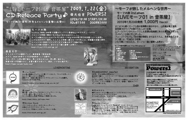 LIVE モーフ01 in 音茶屋 最新視聴ページ とりあえず聞いてみて!! ↓↓↓↓↓↓↓↓↓↓↓↓↓↓ http://www.myspace.com/1004272854 〜LIVE モーフ01 発売記念パーティ〜 モーフの旅は1周年 ありがとうございます 2009/1/22(金)@元住吉POWERS2 OPEN /18:00 START/20:00 ADV¥1500 / DOOR¥2000 ■LIVE モーフの旅 with 奈良大介(From サヨコオトナラ) スペシャル音楽隊セッション ■ライブペインティング nino(funput) ■デコレーション KUNNECUPKAMY ■フライヤーデザイン Dino