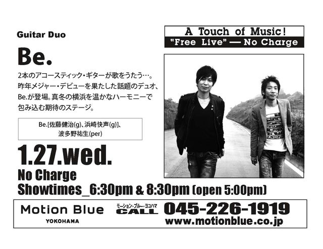 こんにちは。 告知失礼いたします。 ネクストジェネレーションのインスト・ギター・デュオBe.の 2010年一発目のライブは来週です! ☆★Motion Blue YOKOHAMA「A Touch of Music!」★☆ Be.が横浜赤レンガ倉庫内にあるMotion Blue YOKOHAMAで、ライブを行います!! 会場: Motion Blue YOKOHAMA( http://www.motionblue.co.jp/ ) 日時:2010年1月27日(水) 開場 17:00 開演 18:30〜/20:30〜(2回公演) ※チャージフリーライブ(ドリンク代、お食事代はご自身のご負担になります。) 詳しくは「A Touch of Music!」のペ