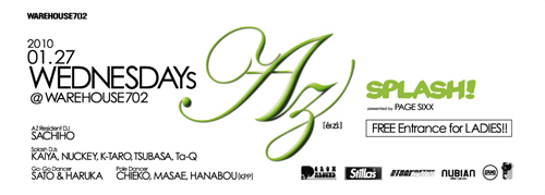 管理人様失礼します。 不適切な場合は削除願います。 1月27日(水曜日) AZ WEDNESDAYs -SPLASH!- @麻布十番WAREHOUSE702 東京都港区麻布十番1−4−5 深尾ビルB1F TEL:03−6230−0343 電車...地下鉄大江戸線「麻布十番駅」 7番出口を出てすぐ左(徒歩3秒) 23:00〜5:00 ■料金 1月誕生日の方入場無料 女性は入場無料 当日料金:\2500/1D ディスカウント:\1500/1D 【AZ Resident DJ】 SACHIHO 【Splash DJ】 K-TARO KAIYA NUCKEY TSUBASA TA-Q 【MC】 MASS TUCKER JIRO 【GO