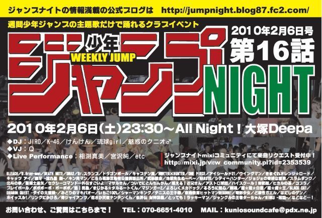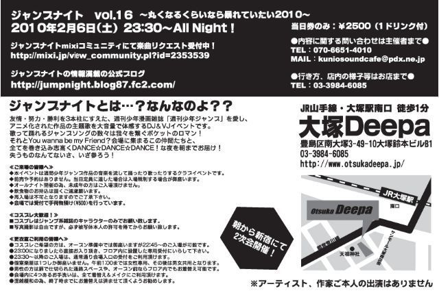 2010年の深夜開催はこの日から炸裂します! “ジャンプナイト”も一晩ジャンプ楽曲づくしのお祭りです。 内容、興奮度共に、 最高テンションを続け2010年に探し物探しに行くのさ! いつもの皆さん、そしてもちろんはじめてご参加の方も大歓迎ですよ。 今回もお誘い合わせの上、ご予定頂けます様よろしくお願いしますね! “ジャンプナイトVol.16” 〜丸くなるくらいなら暴れていたい2010〜 日時:2/6(土)23:30〜All Night! ※終了後も朝から二次会完備! 会場:大塚Deepa 03-3984-6085 住所:豊島区南大塚3-49-10大塚鈴本ビ