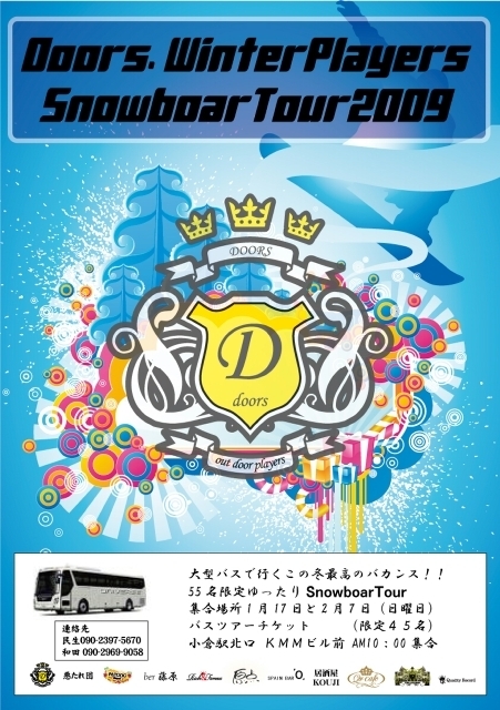 告知失礼します。 DOORS 2010 2/7 (sun) 貸切バスで行く スノボーツァー を募集してます。 前回は、満員御礼で皆様に大好評で、ありがとうございました。 今回のスノボーツァーは、2月7日(日曜日)に決行します。 スケジュールは、前回と同じルートでバスが回る予定です。 集合場所 2月6日 (土曜日) 23時………八幡西区こうじゃく(マックスバリュー駐車場 ) 23時30分…黒崎駅前 24時………小倉駅北口(KMM ビル前