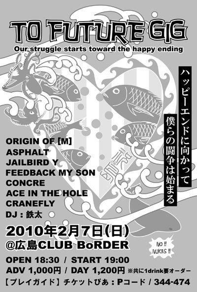 ■2010年2月7日(日)@広島CLUB BORDER -TO FUTURE GIG- Our struggle starts toward the happy ending〜ハッピーエンドに向かって僕らの闘争は始まる ORIGIN OF [M] JAILBIRD Y CONCRE ASPHALT FEEDBACK MY SON CRANEFLY ACE IN THE HOLE DJ:鉄太 VJ:BEN-K アートデコ:ANDO OPEN 18:30/START 19:00 ADV 1000円/DAY 1200円(共に1drink要オーダー) プレイガイド: チケットぴあ:Pコード/344-474 昨年10月に上関原発建設反対をメッセージにNO NUKES RELAYの元、開催されたTO FUTURE GIG!! 「ぶんぶん通信2」上映とライブの