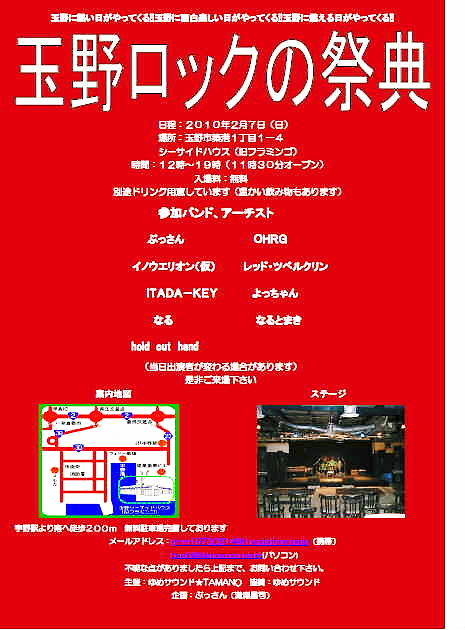 「玉野ロックの祭典」のご案内 日 時:2010年2月7日(日) 12:00 〜 19:00(※11:30開場) 場 所:シーサイドハウス 玉野市築港1丁目1−4(旧フラミンゴ) 入場料:無料 出演者:ぶっさん OHRG イノウエリオン(仮) レッド・ツベルクリン ITADA−KEY よっちゃん なる なるとまき hold out hand ※出演者は変更の場合があります。 主 催:ゆめサウンド★TAMANO 協 賛:☆ゆめサウンド☆ 企