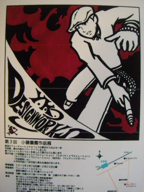 「小藤慶喜作品展」 キャラクターイラストレーション200点 プチイラスト(ファイル)300点ほか ****************************************************** 約1年ぶりの小藤慶喜さんのイラストレーション展 個展は今回で3回目。 前回開催されたよりも点数も増え個性的なキャラクターイラストがたくさんです お友達や同僚のかたをモチーフにしたもので1つとして同じものはなし☆ 鮮やかな色彩で目を楽しませてくれます。 お問い合わせ フューチャーヒャクカフェ 岡山県倉敷市鶴形1-4-22M三原マンション1F 086-