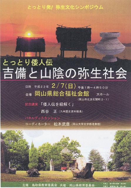 来月、下記のようなシンポジウムが開催されます! 九州VS近畿の論争を吉備と山陰からみてみるのもいいのではないでしょうか。 とっとり発!弥生文化シンポジウム「とっとり倭人伝 吉備と山陰の弥生社会」 日時:平成22年2月7日(日曜日) 午後1時から4時50分 場所:岡山県総合福祉会館 大ホール(岡山市北区石関町2-1) ・JR岡山駅より徒歩約15分、タクシー5分 ・路面電車、東山行き「城下」で下車、徒歩約3分 内容:記念講演「倭人伝を紐解く」 講師 西谷 正氏(九州歴史資料館長) パネルディスカッション: コーディ