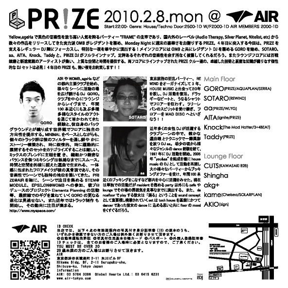 管理人様、告知失礼致します。 2.8Mon ■■■ PR!ZE @ AIR ■■■ Yellow,ageHaで異色の音楽性を放ち高い人気を誇るパーティー"FRAME"の主宰であり、国内外のレーベル(Audio Therapy, Silver Planet, Nitelist, etc)から数々の作品をリリースしてきた実力派OMBがレジデントを務め、Monday Nightに週末の豪華さをお贈りするPR!ZE。4年目に突入する今回は、PR!ZEを支えるレギュラーDJ陣にフォーカスし、特別な一夜を華やかに演出する!メインフロアにはOMBと共にレジデントDJを務めるGOROを始め、SOTARO、aa、AITA、Knock、Taddyと、PR!ZE