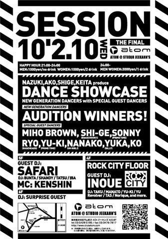 2.10(WED) SESSION SPECIAL THE FINAL!! @渋谷ATOM 今までに数々の話題をつくってきたイベント、SESSIONがファイナルをむかえます。 最後に相応しくSESSION SPECIAL DANCE SHOWに全国トップクラスのGUEST DANCERを筆頭にオーディション合格者の23名を加えた一夜限りのSHOWをお送りします! GUEST DJにもSAFARI ,INOUE!HOSTMCにKENSHINをむかえます。 6階フロアは、新鋭スタイリストとして活動する傍ら(RAY-BAN・VIDALSASSOON・zippo×hoyeecome)などのレセプションパーティーを総プロデュースしているJRMARQUES、チェキのカメラマ