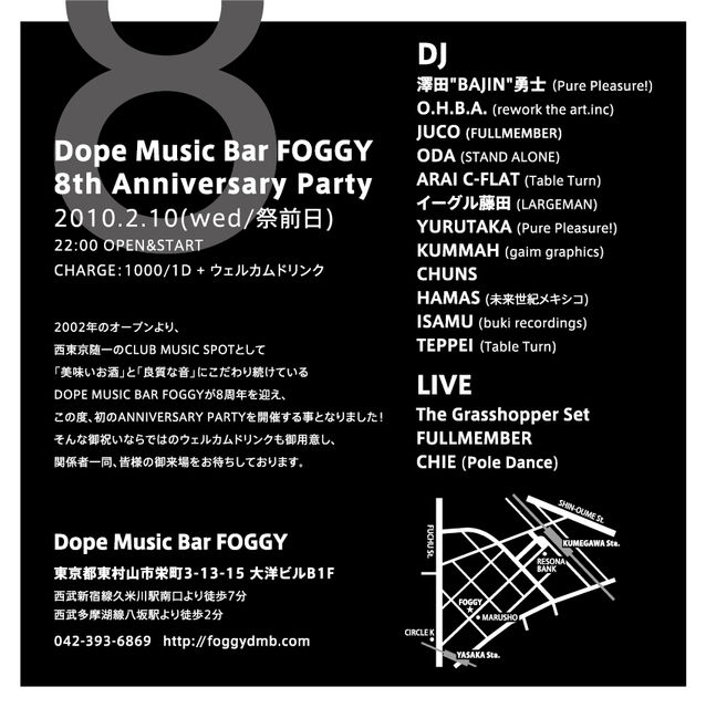 2002年のオープンより、西東京北側随一のCLUB MUSIC SPOTとして「美味いお酒」と「良質な音」にこだわり続けているDOPE MUSIC BAR FOGGYが8周年を迎え、この度、初のANNIVERSARY PARTYを開催する事となりました!