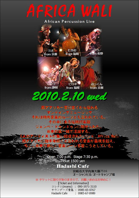 2010年2月10日 ライブ開催!! オープン19:00 スタート19:30 チケット1500円 *枚数に限りがありますのでお早めにお買い求め下さい。 (HadashiCafeでもチケット取り扱っています。) 2/10(水) 宮崎 会場:『Hadashi Cafe』宮崎市大字内海大園7516 オーシャンヒル オートキャンプ場 open:19:00 start:19:30 charge:1,500 〒889-2301 宮崎県宮崎市大字内海大園7516 TEL 0985-67-0989 MAILl aloha@hadashi.biz http://www.hadashi.biz/ 西アフリカ一帯に古くから伝わるマンディングミュージック