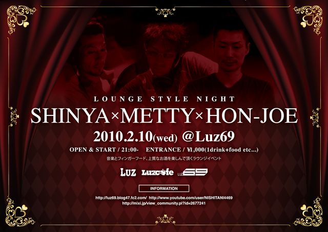 LOUNGE STYLE NIGHT 『SHINYA × METTY × HON-JOE』ナイツ ■2010/2/10 wed ■OPEN / START 21:00- ■@LUZ69 ■genre : HIPHOP / R&B / ROCK / HOUSE ■ENTRANCE 1000yen(1D+finger food) ■DJ DJ-SHINYA DJ-METTY DJ HOJ-JOE http://mixi.jp/view_diary.pl?id=1403066858&owner_id=12668246 ↑METTY日記をご覧下さい!! なんか面白い事になっております いや、面白い事になりそうです!!