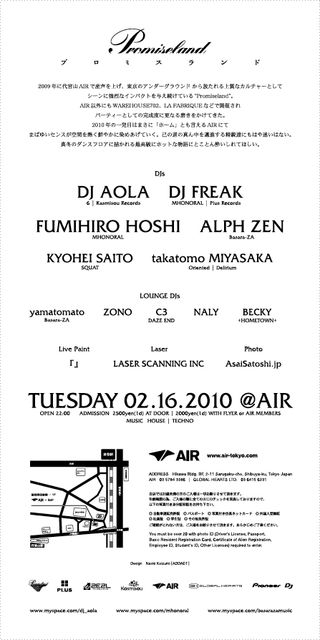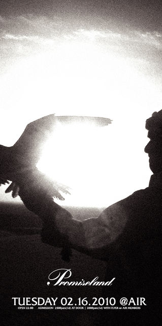2009年に代官山AIRで産声を上げ、東京のアンダーグラウンドから放たれる上質なカルチャーとしてシーンに強烈なインパクトを与え続けている"Promiseland"。AIR以外にもWAREHOUSE702、LA FABRIQUEなどで開催され、パーティーとしての完成度に更なる磨きをかけてきた。2010年の一発目はまさに「ホーム」とも言えるAIRにて、まばゆいセンスが空間を熱く鮮やかに染めあげていく。己の道の真ん中を邁進する精鋭達にもはや迷いはない。真冬のダンスフロアに描かれる最高級にホットな物語にとことん酔いしれてほしい。 【Promiseland】 2010.02.16 (火)