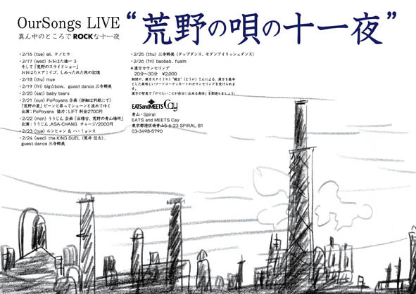 =Our Songs LIVE “荒野の唄の十一夜= 小池アミイゴとCAYとで創る 東京の青山の荒野の唄の時 http://www.yakuin-records.com/amigos/?page_id=3114 ・2/16(tue) eli , テノヒラ ・2/17(wed) おおはた雄一 3  そして「荒野のスライドショー」  おおはた×アミイゴ、しみったれた旅の記憶 ・2/18(thu) mue ・2/19(fri) big☆bow、 guest dance 三寺郷美 ・2/20(sat) baby tears  ・2/21(sun) PoPoyans 企画(詳細は別紙にて) 「荒野の星」 ピーンと昇ってシューンと流れてゆく  出演:PoPoyans 協力:LIFT 料金2700円 ・
