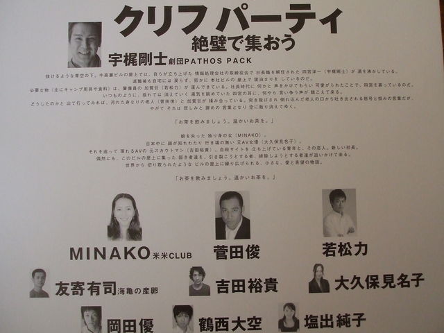 石井美奈子 出演! PATHOS PACK パトスパック 宇梶剛士 再演 「クリフパーティー」 絶壁で集おう 作:宇梶剛士 演出:石田恭子 出演予定:石井美奈子 菅田俊 友寄有人 若松力 吉田裕貴 大久保見名子 岡田優 鶴西大空 PATHOS PACK…宇梶剛士 石田恭子 前売開始:12月16日(水) 料金 全席指定(税込み) 前売り¥3800 当日¥4500 学生¥3000(劇団のみ・要学生証) 2010年2月16日(火)〜21日(日) 16日(火) 19:30 17日(水) 19:30 18日(木)*14:00 19:30 19日(金)*19:30 20日(土) 14:00 19:30 21日(日) 12:30 1