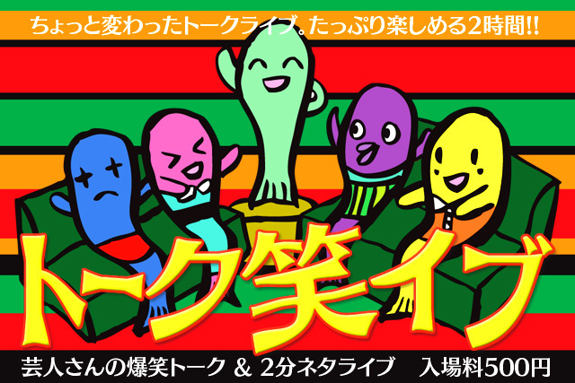 2月16日19時〜「トーク笑イブ」 500円 4組に分かれて、お客様にいただいたお題でトークバトル。 2分ネタコーナーもあります!! 毎回盛り上がってます。 MC : Jaaたけや,ちぇんちぇん 出演者☆Jaaたけや/クロノユウスケ/あご兄さん/西村/前田けゑ/ばいそん/椎名雪絵/ワイルドカード/チップ青木/マッシー/益江ハート/ベストポジション/勅使河原旅人/長谷川務/少年ラジオ/桜富士太/こやま〜☆/平真之丞/ちょちょい前田/TAKA村/中村ティーンズ洋介/ちぇんちぇん 2月17日19時〜「漫才笑イブ」 500円 漫才専門のライブ。賞金目指して20数組がバト
