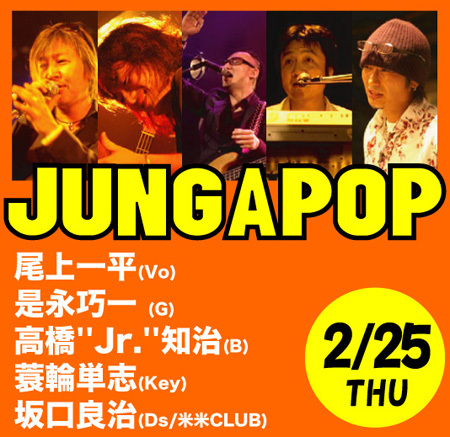 JUNGAPOP LIVE決定です!! 2010年2月25日(木)@高円寺ShowBoat http://www.showboat.co.jp/pick_up/201002.html#25 JUNGAPOP=尾上一平(vo)是永巧一(g) 高橋''Jr.''知治(b) 蓑輪単志(key)坂口良治(ds/米米CLUB) open19:00 / start19:30 adv ¥3500 / door ¥4000(D代別) チケット発売:12/26 15:00〜ShowBoat店頭 (代引郵送・ご予約の受付の同時刻からとなります。) ※本公演は整理番号順のご入場になります※ ShowBoat 03-3337-5745 mail: info@showboat.co.jp