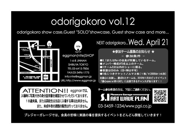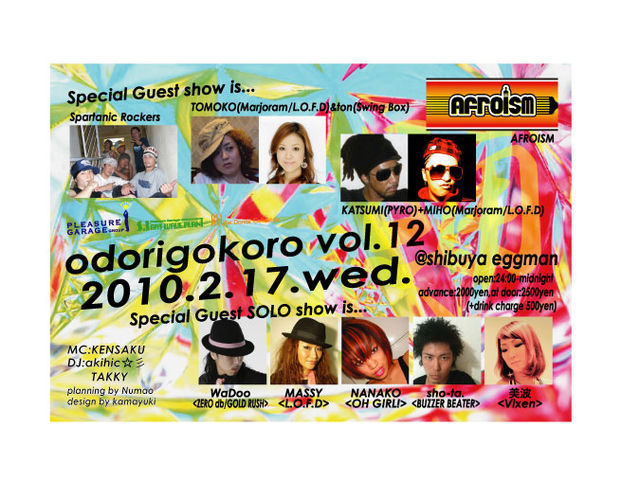2010年2月17日(水) 新年1発目の踊心-odorigokoro-vol.12が開催決定!!!! 踊心-odorigokoro-vol.12@shibuya eggman 24:00open〜midnight adv:\2,000(1drink別)/door:\2,500(1drink別) 今回のスペシャルゲストショーケースもスゴイ事になっております!! OH GIRL!からNANAKOさん出演!! ★☆★special guest showcase★☆★ Spartanic Rockers TOMOKO(Marjoram/L.O.F.D)&ton(Swing Box) AFROISM KATSUMI(PYRO)+MIHO(Marjoram/L.O.F.D) そして・・・ソロゲストショーケースも決定! 踊心じゃなきゃ見れない豪華メンバー! -solo