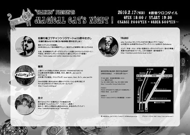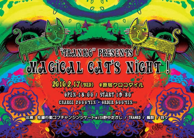 "TRANKO" presents MAGICAL CAT'S NIGHT! 2/17/18:00open/19:30start 2000yen+drink 原宿クロコダイル(03-3499-5205) http://crocodile-live.jp/index2.html ■ 佐藤行衛コプチャンシンジケイトwith野中たかし Member: 佐藤行衛(vo,g) 川口雅己(g) 菊池明(b) 野中たかし(ds) http://www.yogiga.com/yukie/Japanese/jp_index.html ■TRANKO Member: anko(vo,g,syn)ヨシノトランス(sitar) 森山シゲジー(tabla) 山中寛大(b) 山本淳平(ds)(fromプラハデパート) 山田まや (ベリーダンス) http://members.jcom.home.ne.jp/a.nko/