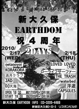 2/17(水)新大久保EARTHDOM 【EARTHDOM 4TH ANNIVERSARY】 KORA KORA netanoyoi 満月倶楽部 DJ 天海 2AD OPEN 18:30 START 19:00 前売 1700円 当日 2000円 (別途ドリンク代 500円) 東京都新宿区大久保2-32-3 リスボンビルB1 TEL&FAX 03-3205-4469