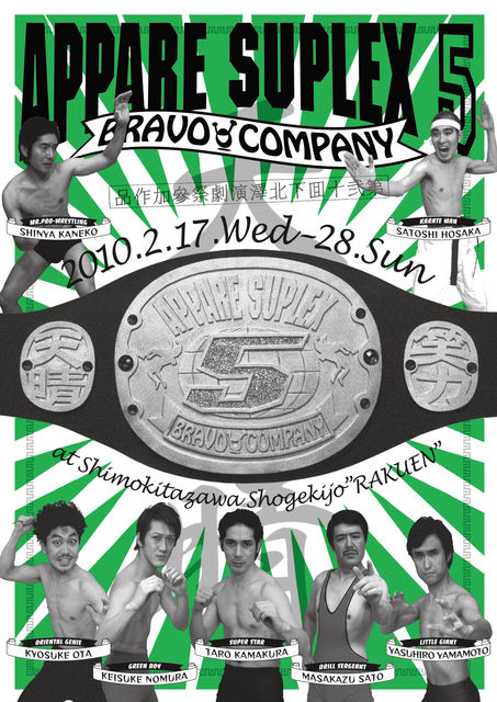 第20回下北沢演劇祭参加作品 ブラボーカンパニープロデュース 天晴◎お気楽事務所第32回公演 『天晴スープレックス5』 ◆出演 鎌倉太郎・金子伸哉・野村啓介・山本泰弘・佐藤正和・太田恭輔・保坂聡 ◆作・演出 福田雄一 ◆日時 2010年2月17日(水)〜28日(日) 17(水)・18(木)・19(金) 19時〜 20(土) 14時〜/19時〜 21(日) 14時〜 22(月)・23(火)・24(水)・25(木)・26(金) 19時〜 27(土) 14時〜/19時〜 28(日) 14時〜 ※受付開始は全公演とも開演