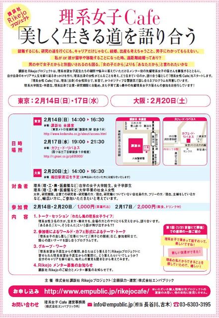 理系女子の大学院生・学生、社会人の皆さん、 分野・世代を超えてつながり、後輩たちを応援しませんか? ━━━━━━━━━━━━━━━━━━━━━━━━━━━━━━━ 講談社 Rikejo プロジェクト 理系女子Cafe 「美しく生きる道」を語りあおう! −−−−−−−−−−−−−−−−−−−−−−−−−−−−−−− 東京(2月14日(日)、17日(水)) 大阪(2月20日(土))で開催! http://www.empublic.jp/rikejocafe/ ━━━━━━━━━━━━━━━━━━━━━━━━━━━━━━━ ♯就職するにも、研究の道を行くにも、