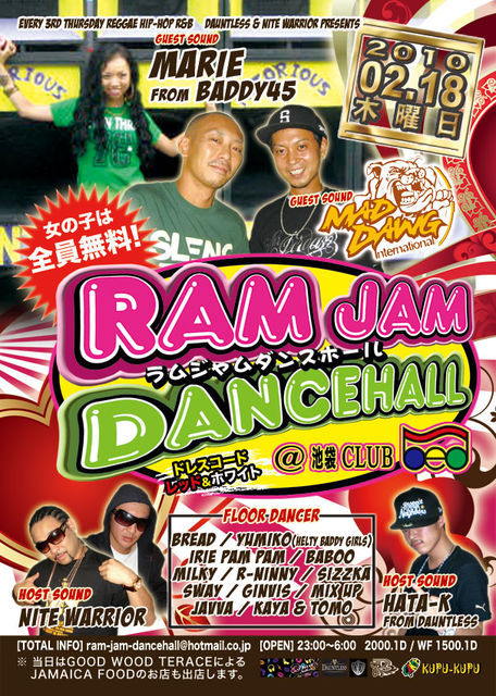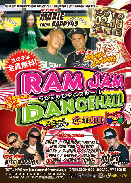 2010 2/18 (木) RAM JAM DANCEHALL @池袋bed <SPECIAL GUEST SOUND> MAD DAWG MARIE From BADDY45 <HOST SOUND> HATA-K from DAUNTLESS NITE WARRIOR <FLOOR DANCERZ> BREAD / YUMIKO(H.B.G) / IRIE PAM PAM / BABOO/ MILKY / SIZZKA / R-NINNY / SWAY / JAVVA / GINVIS / MIX UP / KAYA&TOMO <FOOD> GOOD WOOD TERRACE ★ドレスコード★ 〔レッド&ホワイト〕 ◎先着30名様にMIX CDプレゼント!!! Open/23:00〜6:00 ADM:女性は全員無料! 2000.1D W/Flyer1500.1D Mixi見たと言えば1500yen/1Drinkで入れます!