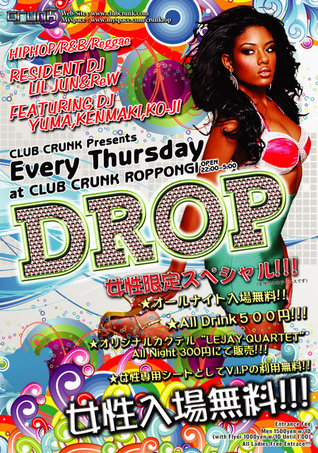 毎週木曜日!!! HIP HOP,R&B PARTY “DROP” 〜Ladies Night〜 2月18日(木)@六本木club CRUNK HIPHOP,R&B,REGGAE PARTY 10時〜 1500円/1d 【DJs】LIL JUN/ReW/KENMAKI/SHOWHEY ■LADIES SPECIAL■ *All Ladies Free Entrance!!!女性入場無料! * 女性はAll Drink 500yen! *オリジナルカクテル”LEJAY-QUARTET”All Night 300yen(女性限定) *Ladies専用シートとしてVIPの利用無料! ■MIXI特典■ *エントランスにて『RYOTAのMIXI見ました』と言って頂ければ男性も1000円/1d