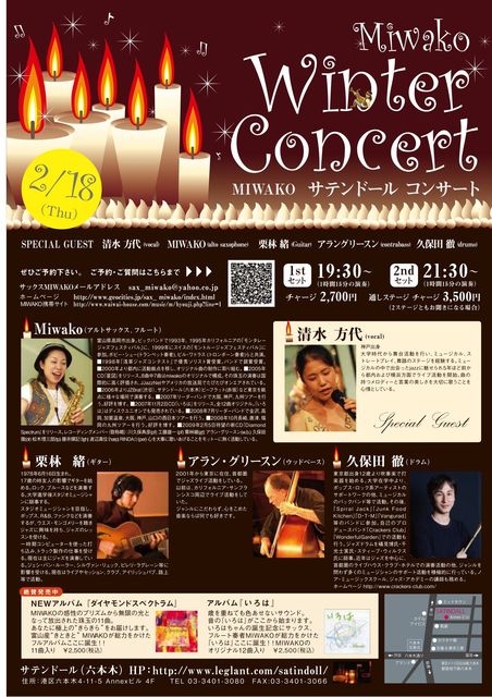 次回サテンドールは、甘い音色で定評のある栗林 緒(くりばやし つづき)さんをお迎えします。バレンタインの季節をさらにあま〜くお送りします^^ ■miwako4 スペシャルコンサート 日時: 2月18日(木) 出演: miwako(alto saxophone) 栗林緒(guitar) アラングリースン(contrabass) 久保田徹(drums) 清水方代(vocal) 場所:サテンドール(六本木) HP:http://www.leglant.com/satindoll/ 住所:港区六本木4-11-5 Annexビル 4F TEL 03-3401-3080 1st セット 19:30〜(1時間15分の演奏) 2nd セット 21:30〜(1時間
