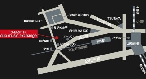 「ナマオト」 結構広い会場です ◆日時 2010年02月18日 木曜日 オープン18:00〜 スタート19:00〜 ◆出演者 ChagraいつかTHE R.A.Y.S.SamuelleDOMINO and more... ◆場所 shibuya DUO 〒150-0043 東京都渋谷区道玄坂2-14-8 O-EASTビル 1F TEL : 03-5459-8716 HP : http://www.duomusicexchange.com/ アクセス JR山手線 渋谷駅 ハチ公口 徒歩約8分 JRハチ公口より、道玄坂を通り、道玄坂上交番前の交差点まで行きます。 右側