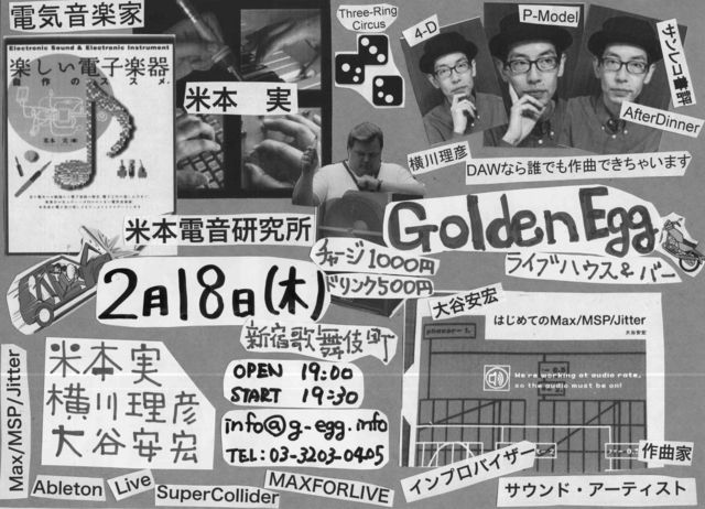 2010年2月18日(木) 横川理彦を中心に展開するセッション企画第一弾! 出演:横川理彦 米本 実 (電気音楽家 ヨネミン開発者 付けのうまい音楽家) 大谷安宏 OPEN 19:00 START 19:30 チャージ:1000円 ドリンク: 500円 ライブ&バー新宿歌舞伎町 Golden Egg 電話 03-3203-0405 http://www.g-egg.info/ 企画:横川理彦&大谷安宏 よろしくお願いします。