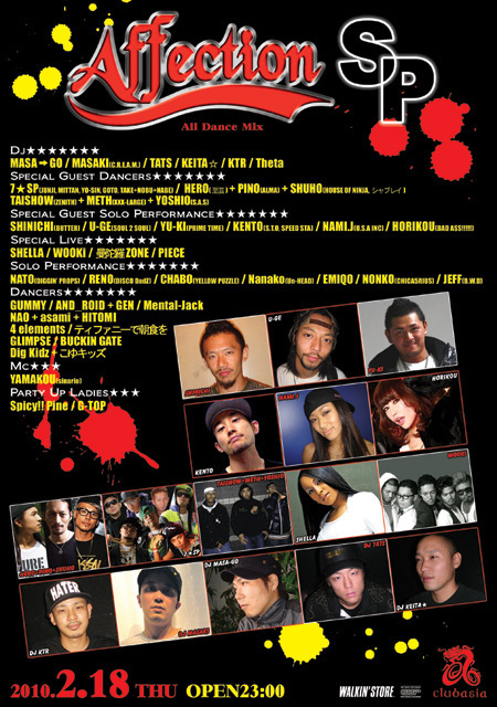 2010.2/18(木) Affection SPECIAL @ clubasia Good Dance Music!!! ・‥…━━━☆・‥…━━━☆・‥…━━━☆・‥…━━━☆・‥…━━━☆‥…━━━☆・‥… 2010年最初のAffectionももちろん第3木曜の夜からスタート!今回も豪華出演者が決定しました。人気ダンサーが集結したモンスターチーム"7☆"に、今回はRAG POUNDのNOBUと、SCREAMのNABEが参加!その名も"7☆SP"。世界で活躍する"HERO+PINO+SHUHO"によるハウススペシャルユニットに、アンダーグラウンドダンスシーンにおいて間違いなく重要なこの3人"TAISHOW+METH+YOSHI