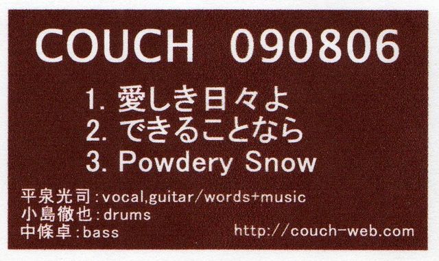 お待ちかね、今年の初カウチでございます。 2010 年 2月18日(木) 吉祥寺 MANDA-LA2(Tel:0422-42-1579) http://www.mandala.gr.jp/man2.html 出 演:タマコウォルズ COUCHhttp://www.couch-web.com (平泉光司:vo,g/小島徹也:ds/中條卓:b) open 18:30 / start 19:30 前売2800円/当日3000円(各ドリンク代別途) 親交の深い平泉=西池さんラインで久々に実現した夢の共演(=饗宴)カウチ×タマコウォルス! '07年タマコ主催「マダラ紛争」以来のカップリングですが、その間も中原さんとは『サニーロック!』で、高橋さん&佐藤さん