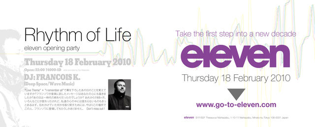 2/18(THU) Rhythm of Life-eleven opening party- @eleven Open: 22:00 \4000-1D artist promoted by Ryo Watanabe DJ: Francois K.(Deep Space/Wave Music) eleven 東京都港区西麻布1-10-11セソーラス西麻布B1/B2 Tel: 03-5775-6206 Fax: 03-5775-6207 http://www.go-to-eleven.com ☆★ATTENTION!★☆ 20才未満の方の御入場をお断りしております(要写真付き身分証明書)